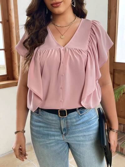 Plus Size Women's Solid Color Single Breasted Shirt With Ruffle Hem-30%