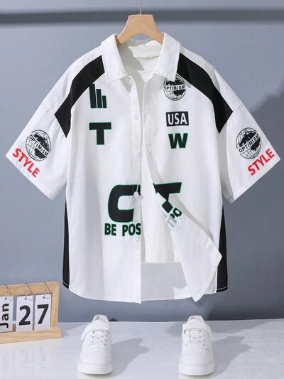 Tween Boys' Casual Street Style Letter Printed Turn-Down Collar Short Sleeve Loose Weave Shirt-46%