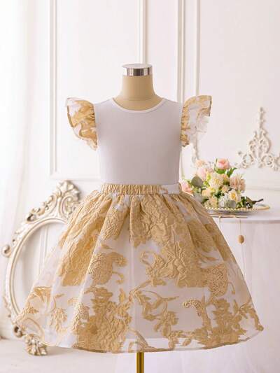 Tween Girl 2pcs/Set Gorgeous Elegant Jacquard A-Line Skirt With Ruffle Trimmed Top For Party And Festival
