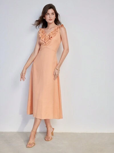 V-NECK EMBROIDERY RUFFLE TRIM DRESS-23%