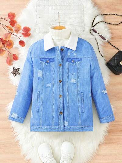 Tween Girl Denim Effect Splice Coat With Collar And Lining-60%