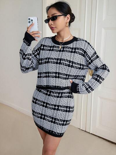 Plaid Pattern Drop Shoulder Sweater & Knit Skirt Fall Cloth For Women-65%