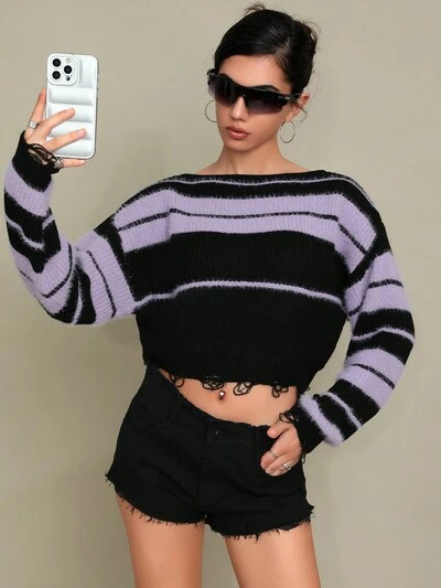 Striped Pattern Drop Shoulder Distressed Hem Sweater-60%