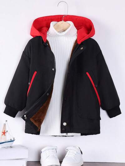 Young Boy 1pc Contrast Trim Teddy Lined Hooded Padded Coat