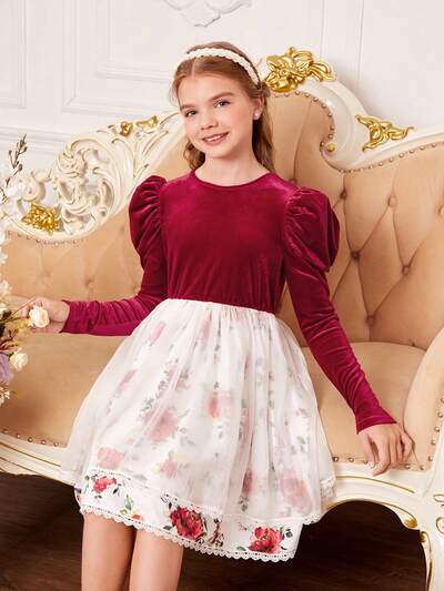 Girls' Knit Plain Short Plush Round Neck Elegant Dress-65%