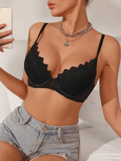 Women's Black Lace Push Up Bra With Scallop Detail And Medium Stretch Fabric-65%