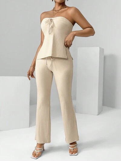 Solid Split Hem Tube Top & Flare Leg Pants-65%