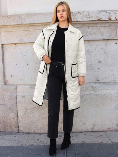 Color Block Loose Padded Mid-Length Coat With Hem Winter White Casual-60%