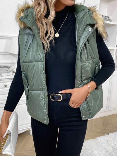 Ladies' Solid Color Zipper Closure Short Padded Vest Jacket Winter Green Casual Christmas