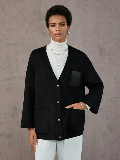 Solid Button Front Dual Pocket Drop Shoulder Overcoat Fall Cloth For Women-60%