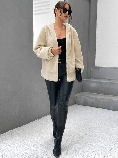 Drop Shoulder Hooded Teddy Coat-65%