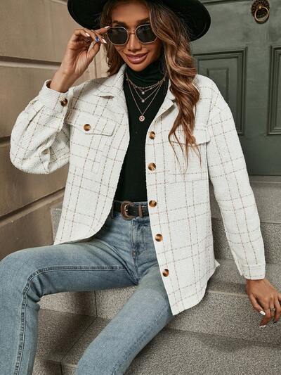 Plaid Flap Pocket Drop Shoulder Tweed Overcoat Fall Cloth For Women-65%