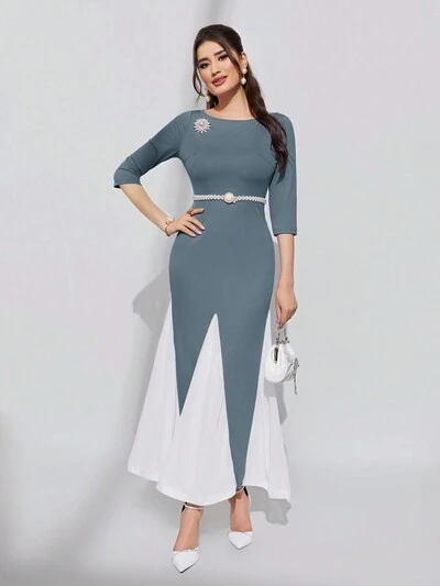 Women's Patchwork Ribbon Accented Waistline Flared Sleeves Mermaid Hem Dress Long Evening Dresses-65%