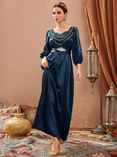 Women's Sparkly Patchwork Lantern Sleeve Belted Arabic Style Dress-65%
