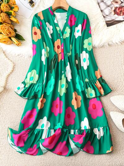 Plus Size Women's Floral Printed Ruffle Sleeve Dress