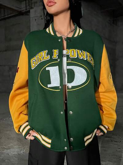 Women's Color-blocking Letter Printed Baseball Collar Jacket