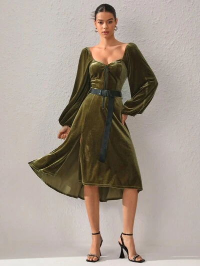 Designer Women's Velvet Sweetheart Neck Lantern Sleeve Dress,Elegant Dress,Fall New Year Eve Outfit, For Autumn & Winter, Holiday, Party-65%