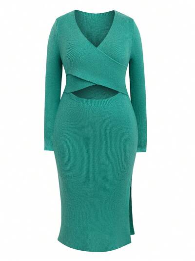 Plus Size Hollow Out Knitted Wrap Front Slit Sweater Dress-65%
