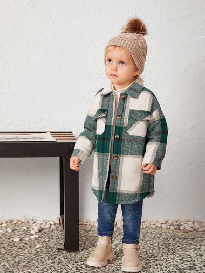 Baby Girl Plaid Print Flap Pocket Drop Shoulder Overcoat-65%