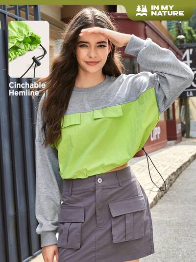 Colorblock Flap Pocket Drawstring Hem Outdoor Tee-65%