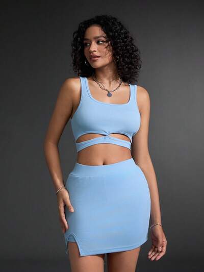 Women's Plain Hollow Out Crop Top And Skort Sports Set-67%