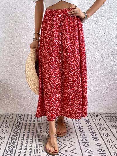 Women's Ditsy Floral Elastic Waist Button Design Casual Midi Skirt-25%