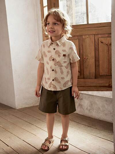 Young Boy Daily Comfortable Casual Set, Leaf Pattern Lapel Short Sleeve Shirt And Solid Color Shorts-56%