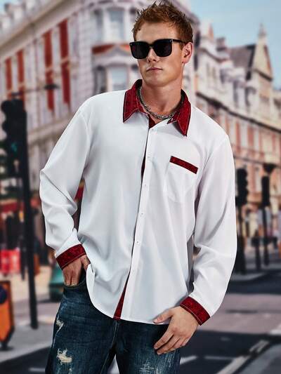 Mężczyźni plus size Kontrastowa lamówka Kieszeń połatana Koszula-60%