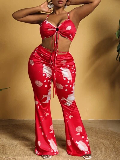 Rozmiar Plus Damski Nadruk w kropki Top Halter I Pofałdowany Spodnie z rozkloszowaną nogawką Komplety Biżuterii