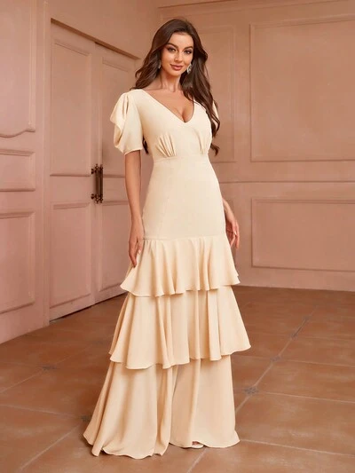 Sukienka druhny Z Głęboki Dekol w kształcie V , Bufiaste Rękawy , wielopoziomowy Falbankowy brzeg-41%