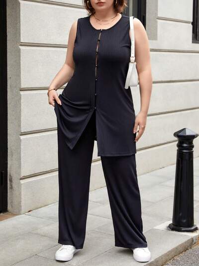 Conjunto De Duas Peças Para Mulheres Plus Size Top Preto Sem Manga E Calça Longa Para Primavera E Verão-29%