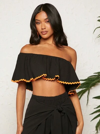 Blusa Cropped De Ombro Vazio Feminino Com Pregas E Decoração De Renda Para Férias-33%