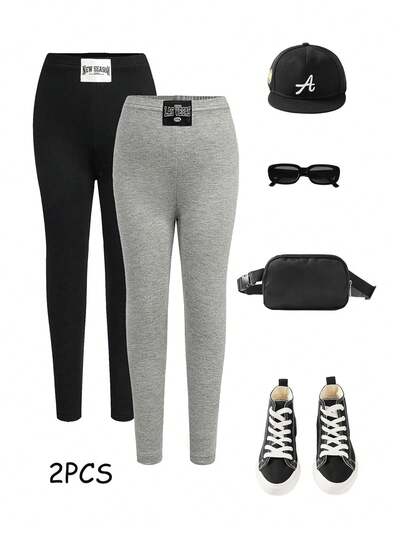 Conjunto de top e leggings casuais tricotados em cor sólida com estampa de letra para garotas.-60%