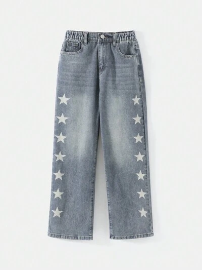 Jeans Casual de uso diário com estampa de estrela em estilo vintage americano para Meninas Pré-Adolescentes