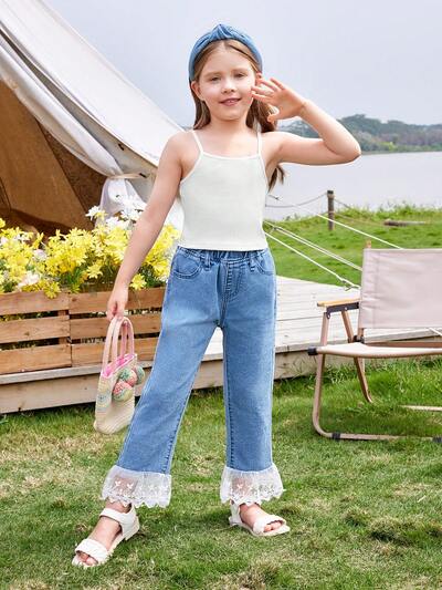 Calça Casual Longa para Adolescentes com Cor Limpa em Tecido Trançado, Fita de Crochê nas Pernas e Acabamento com Babado da Praia