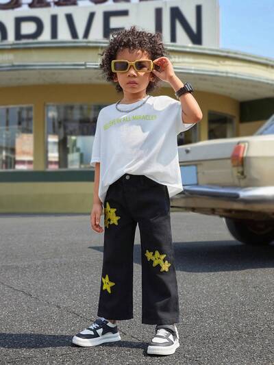 Calças Jeans Pretas Infantis Casuais Estilosas Confortáveis com Padrãode Bordado de Estrelas Coloridas. Possui Corte Reto e Solto, ideal para Uso Diário