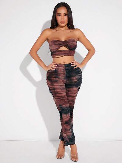 Conjunto Feminino Tie-dye Vazado Sem Alças E Calça Comprida Conjunto De Duas Peças-23%